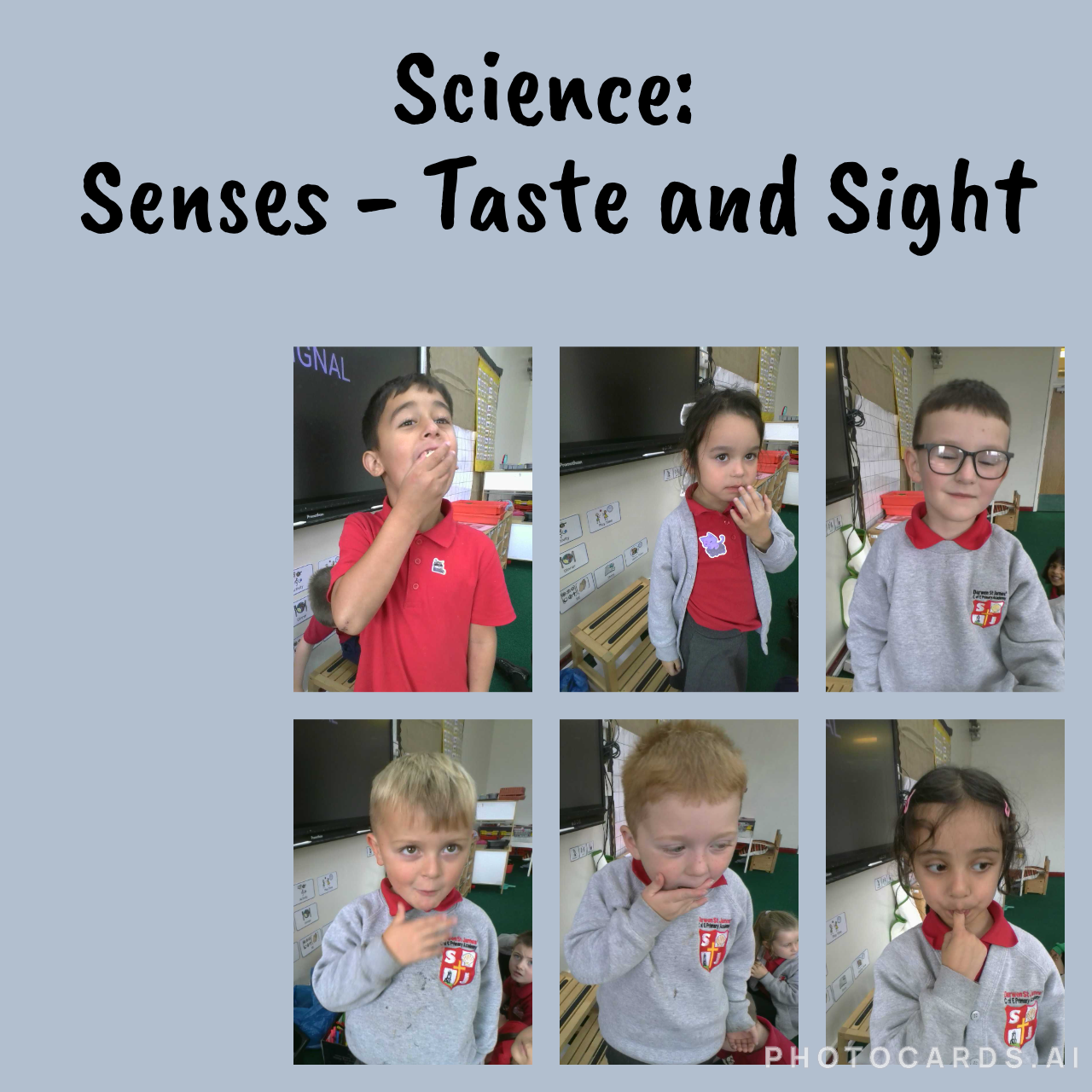 In science we have been learning about the 5 senses. We looked at and tasted foods to use 'smell' and 'sight' senses. The children tasted lemon juice, chocolate, popcorn and dark chocolate and used the terms 'sour, sweet, salty and bitter' to describe them.