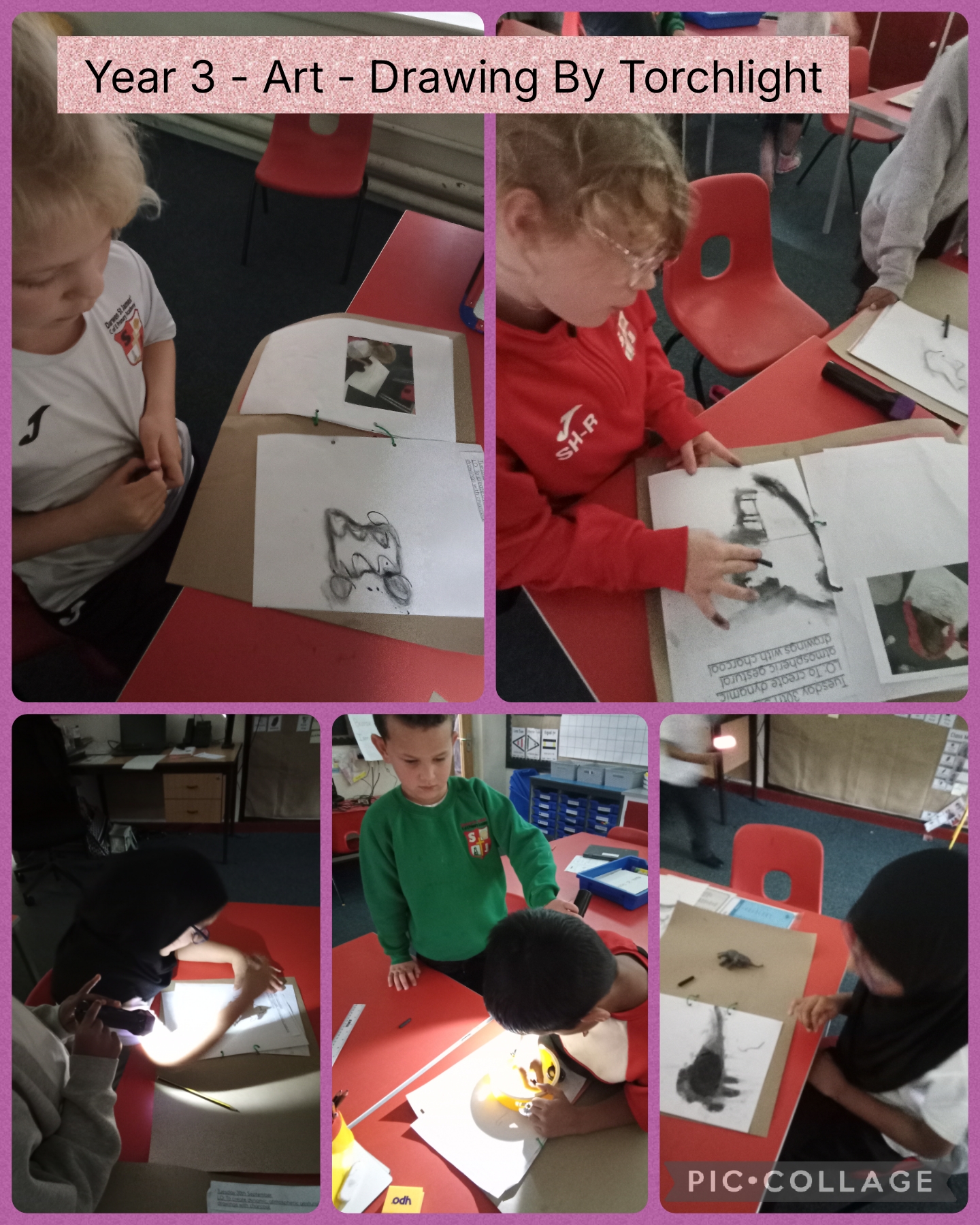 Our Year 3 students had a wonderfully atmospheric art lesson this week as they explored the dramatic effects of light and dark by drawing with charcoal by torchlight!