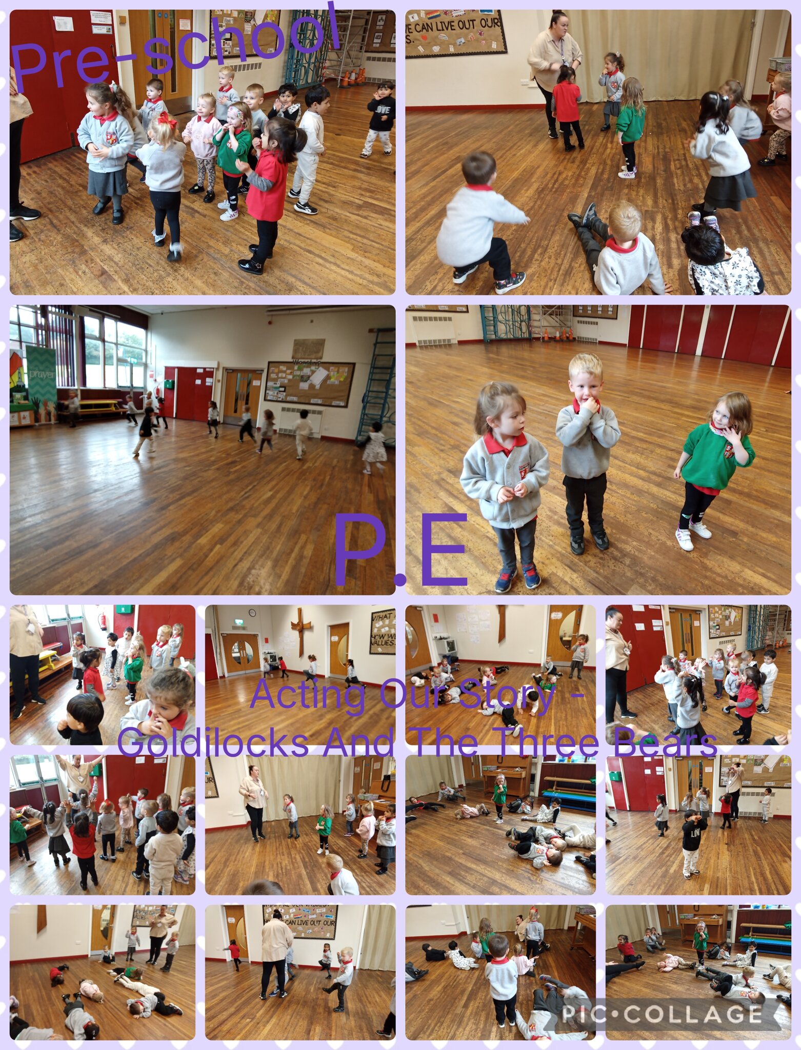 In P.E this week Pre-School have been acting out their story- Goldilocks and the hree Bears. We talked about each step of the story before acting out the action for each step, using big, medium and small actions.