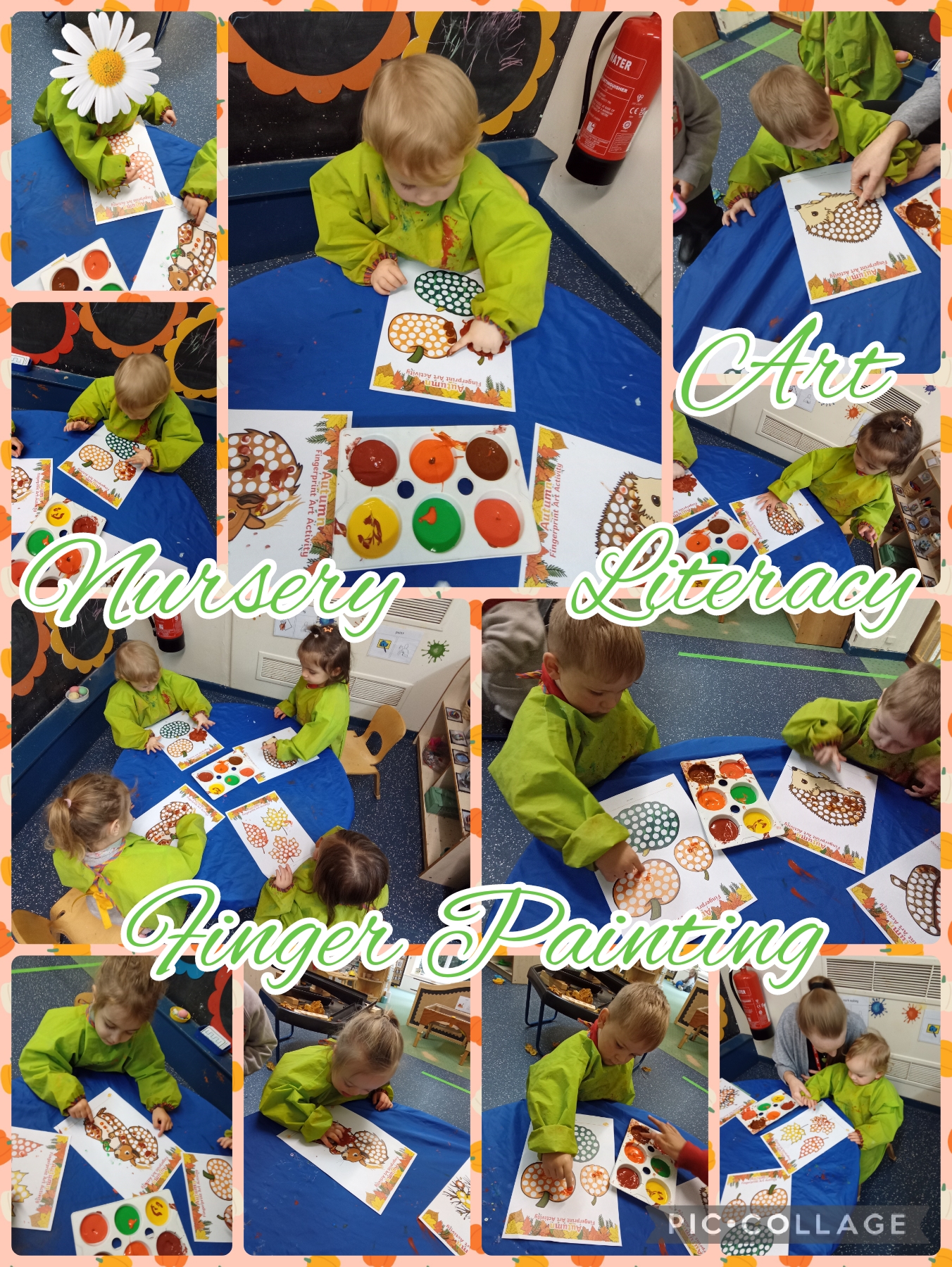 During our Art and Literacy lesson, the children explored autumnal coloured paints and learned a new technique using their fingers as their painting tool. The task focused on refined movements to develop fine motor control. The children were taught how to carefully dab one finger into the paint and then press it onto their paper, successfully creating a controlled dot or fingerprint. They worked with autumnal images that had designated white spaces, requiring them to select a colour and deliberately fill in the void using this specific finger-painting technique. While it was initially tempting for some to use their whole hand and "go wild" with the paint, the children did a brilliant job practicing this new, refined skill, demonstrating excellent self-regulation and control to create beautiful, textured autumnal pictures.