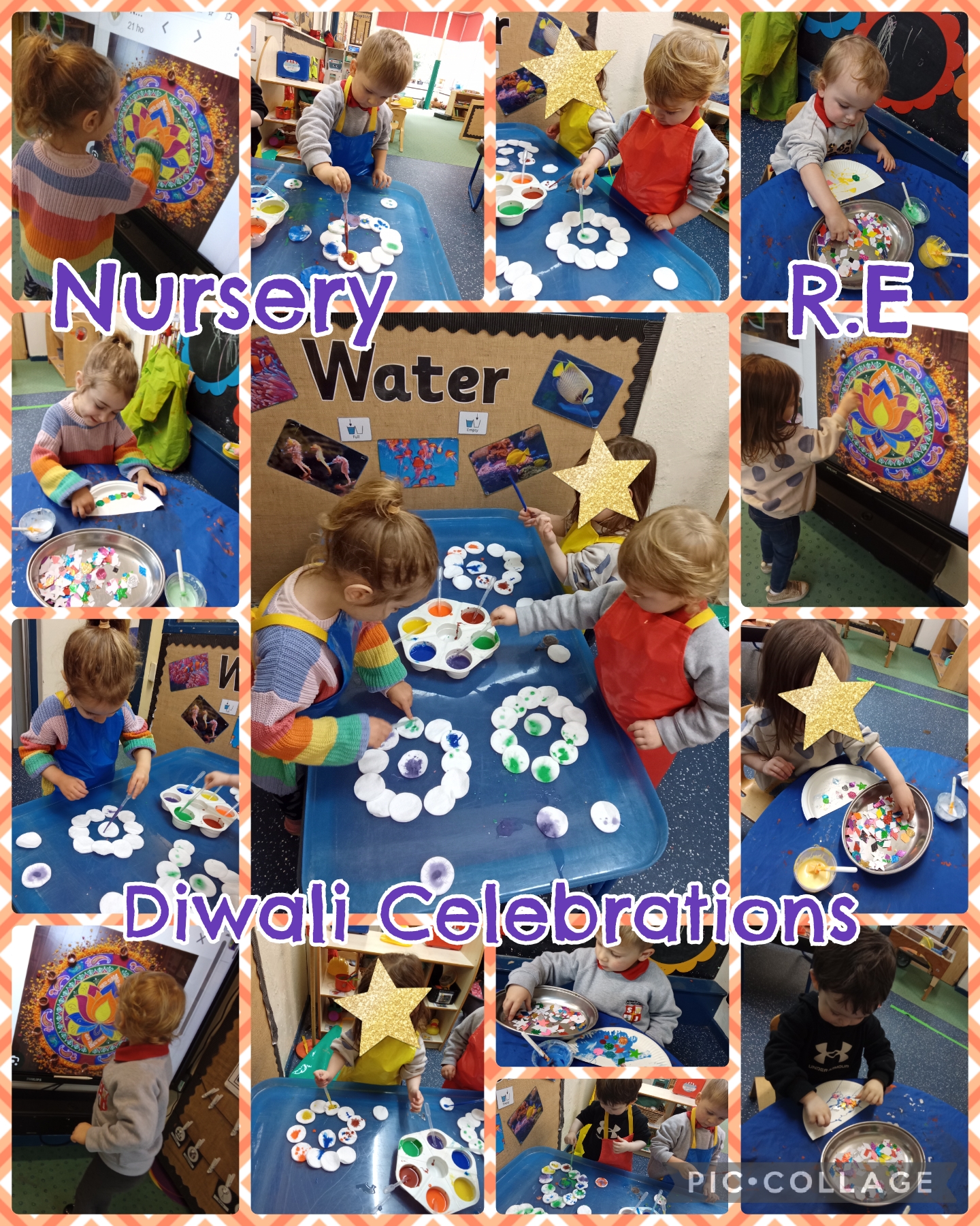 Today, the children were introduced to a new cultural and religious celebration: Diwali, the Festival of Lights. We began by exploring the concept of celebrating good over bad and the spreading of light in the world. To enhance their understanding of this vibrant celebration, we looked at several inspirational images. The children then engaged in two wonderful, hands-on activities: in the water tray, they explored colour and pattern, mirroring the beautiful Rangoli designs by carefully using pipettes and watered-down paint to create circles of colour. Simultaneously, they accessed the craft area to make festive Diwali lights, using a variation of glittery shapes in many bright colours to decorate their creations. This provided a rich, sensory, and visual introduction to a new religious and cultural tradition.