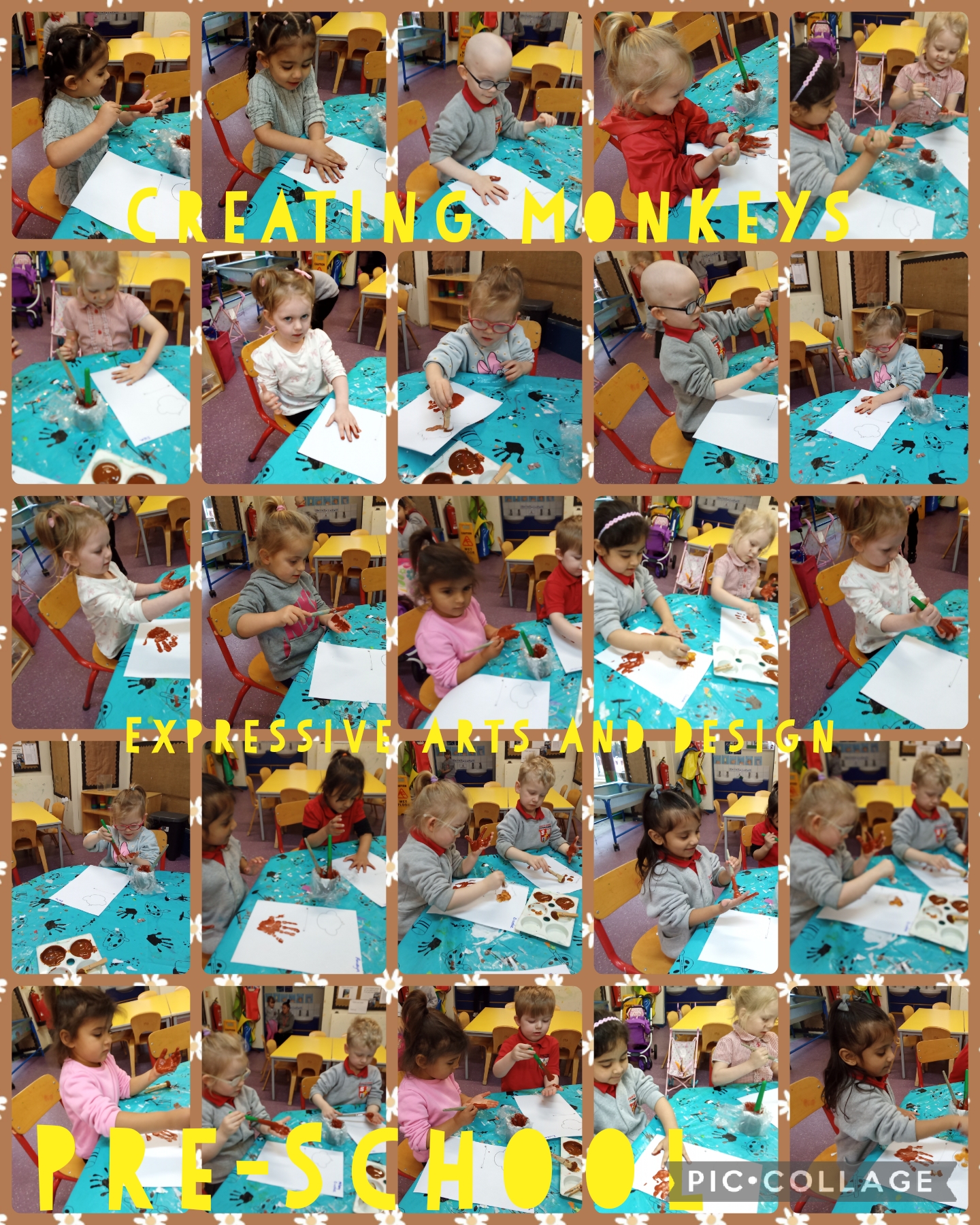 In literacy this week our story is HUG. The story is about a monkey that can't find his mum and needs a hug. The children used their skills to create a monkey by painting their hands to print for the monkey body and painting the head to create their monkey.