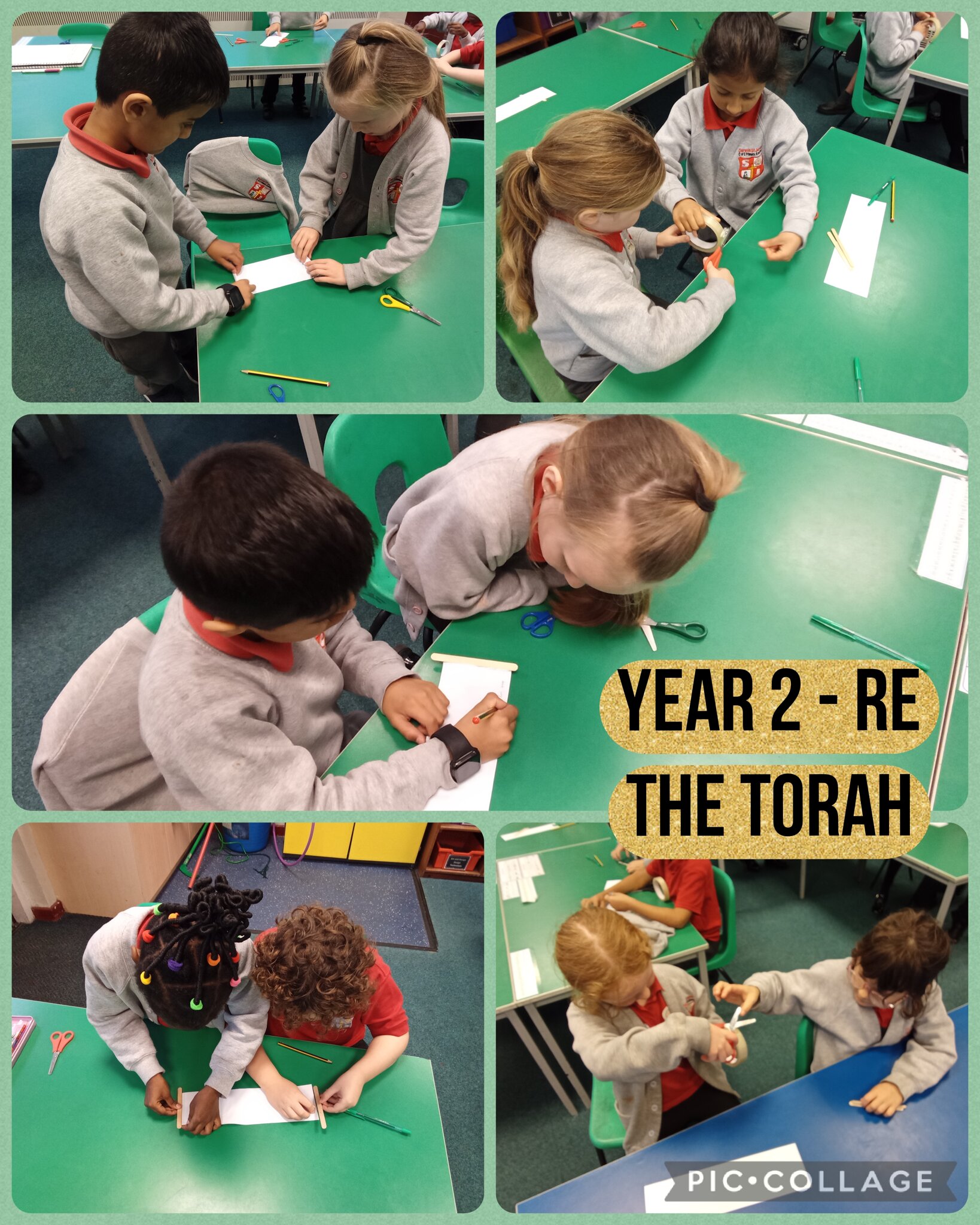 In RE, we explored the Torah scrolls, the holiest Jewish religious text. We learned that the Torah is handwritten and contains the Ten Commandments from the word of God. Because the scroll cannot be touched directly, readers use a special pointer called a Yad to follow the text.
