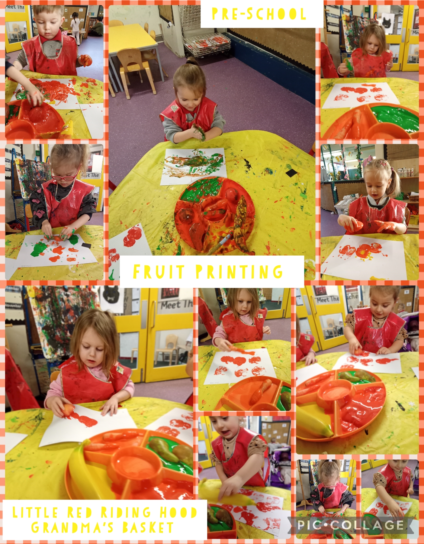 This week has been a very arty week , The Children have enjoyed getting messy while fruit printing. The children discussed what fruits might have been in grandma's basket from our story little red riding hood. The children used apple,banana,pear and carrot to dip in to paint to create their fruit print picture.