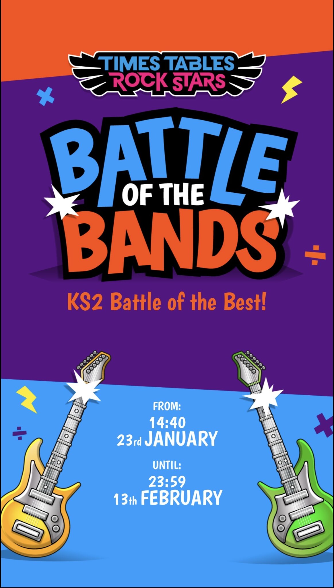 The battle runs from today until 13th February. During that time, children can contribute to their class score for up to one hour a day on Times Tables Rock Stars. Every correct answer counts, so regular practice really will make a difference.