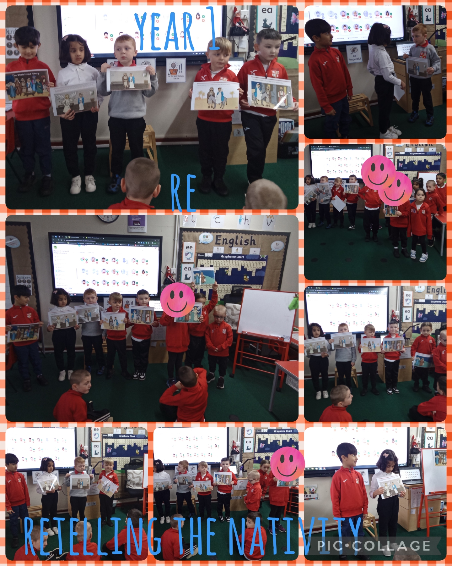 The children in Y1 worked together to retell the Nativity story, using picture prompts to help them remember each part. They took turns speaking to the class, explaining what was happening and listening carefully to one another.